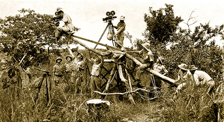 TEAMWORK: Here, director W.S. "Woody" Van Dyke, II (looking into a viewfinder of the lead camera), in assocation with cinematographer Clyde De Vinna, utilized some trees to serve as a make-shift camera crane while on location in Africa for the film Trader Horn. This 1929 film also marked the first time Hollywood shot a film with its principal actors in Africa. Photo courtesy of Rudy Behlmer.