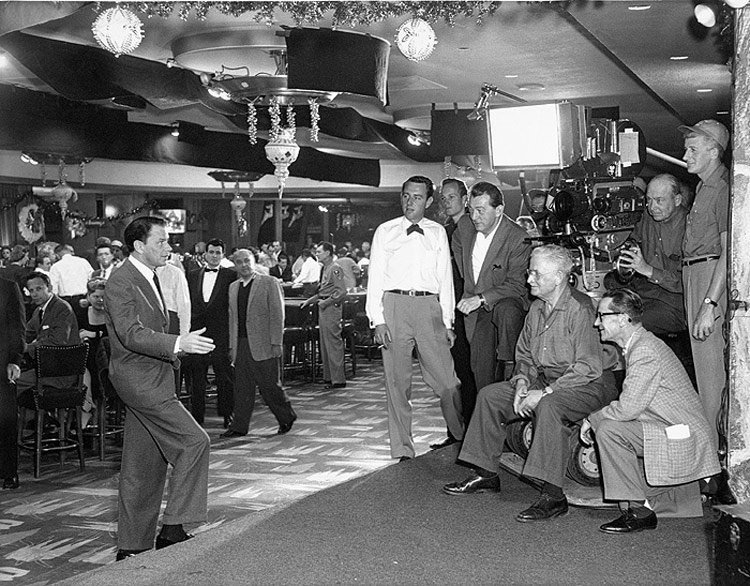 PLEASED TO MEET YOU: On the set of the 1960 "Rat Pack" classic Ocean's Eleven. From left is producer and star Frank Sinatra, first assistant director Ray Gosnell (in white shirt), second assistant director Cliff Coleman, director Lewis Milestone, cinematographer William Daniels (seated) and production manager Jack Birne (kneeling). Photo courtesy of Ray Gosnell.