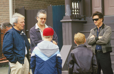 Eastwood (left) with actors Tim Robbins, Sean Penn and the child actors portraying them on the set of Mystic River