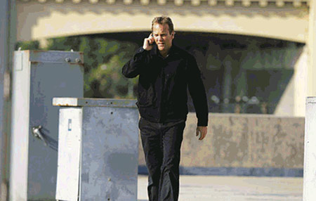 (Top) In Los Angeles, director/executive producer Scott Brazil on the interior of The Shield (below) Keifer Sutherland, as agent Jak Bauer, on location at the L.A. Coliseum for a scene in 24