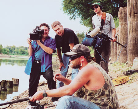 Filming Stevie. Subject Stephen Fielding with fishing pole, and from left, cinematographer/producer Gordon Quinn, director Steve James, soundman/producer Adam Singer