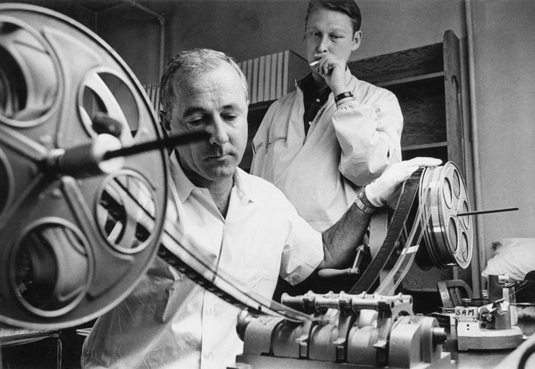 THE EDITING ROOM: In the editing room cutting Who's Afraid of Virginia Woolf? are (from left) editor Sam O'Steen and director and this year's DGA Lifetime Achievement Award recipient, Mike Nichols. Virginia Woolf was the beginning of a long and successful collaboration between Nichols and O'Steen. They would team up on 11 other pictures: The Graduate, Catch-22, Carnal Knowledge, Day of the Dolphin, Silkwood, Heartburn, Biloxi Blues, Working Girl, Postcards From the Edge, Regarding Henry and Woolf. In addition, O'Steen was a member of the Directors Guild of America and was awarded the 1975 DGA Award for his direction of the movie for television Queen of the Stardust Ballroom. From the five television winners that year, O'Steen was also selected as the most outstanding television director. (Photo courtesy of Bob Willoughby)