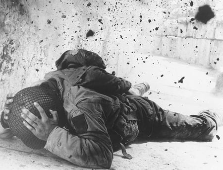 On the other hand, what we do have is, I think, remarkable: 15 entirely new sequences as well as inserts and extensions added to another 23 sequences. A film that went out 24 years ago at one hour, 53 minutes and 11 seconds is now two hours, 42 minutes and 56 seconds — within seconds, incidentally, of the lost Ambersons' footage. Some of these additions are (seemingly) minor: an opening title card ("This Is Fictional Life, Based on Factual Death"); The Big Red One, on the First Division's shoulder patch shown as the only splash of color in the film's black-and-white prologue; Sam himself playing a combat cameraman in short sequence. Some of them are major. For example, a battle between a German tank and some French horse soldiers in a Roman Amphitheater in North Africa; a heartbreaking sequence in which a little Sicilian girl is shot by a sniper as she embraces Lee Marvin (whose laconic tenderness constitutes great movie acting); a powerful sequence in which his habitual stoicism is shattered by the discovery of an infiltrator who has actually joined his squad for breakfast in a Belgian kitchen.