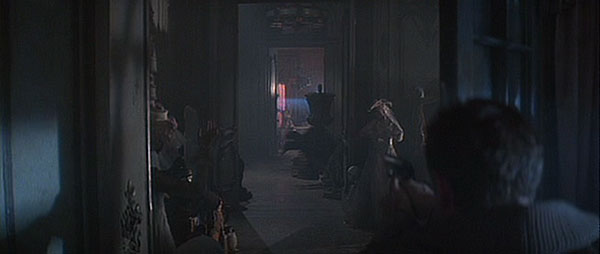 Harrison would fire his gun and, a millisecond later, there’d be a second explosion further down on the set. It all had to do with timing, with the floor effects guy and how good his reflexes were. We’re on an anamorphic lens, where the depth of field can be problematic, but I like the quality of anamorphic–the drop-off in focus is very attractive and very filmic. In this shot, from room to room has got to be at least 60 feet, so you’ve really got to understand your emulsion and your meter to get the kind of images we were getting. And [cinematographer] Jordan Cronenweth certainly knew that.