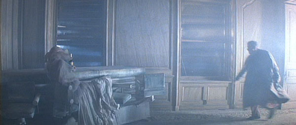 I wanted the apartment to be late-nineteenth-century, just to get away from the modern decay that we’d represented in the city. This is old grandeur, someplace you might have seen in a David Lean movie. And this guy in his overcoat is really right out of a nicely drawn comic strip–a Philip Marlowe comic strip, with the added assistance of the flashing lightning. Maybe lightning is a bit overused, but it works very well here.