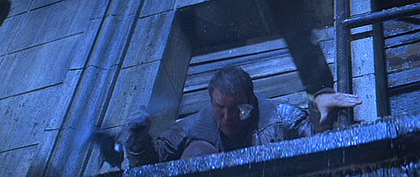 I think a lot of people missed the point of this shot: If Deckard had said, ‘Please don’t let me fall,’ Batty probably would have stomped on his hand. But it’s Deckard’s defiance that impresses Batty, so in a flash he grabs Deckard’s hand and stops him from falling. For this scene, we had Harrison hanging on a cable. But I think we may have managed to do a bit of cable removal. You spray it black, or sometimes you mottle it so that it’s black and silver, until you find that for the speed of the shot it’s mostly not there.