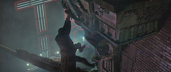 When Deckard jumps across that gap, he lands between two of these beams that are sticking out, and I was always worried that he would land on his chest against the beam. I wouldn’t allow Harrison to do it, so the stuntman, Gary Combs, who was quite a good double for Harrison, did it. What you see behind him isn’t a matte, but rather the façade of the building he’s just jumped from.