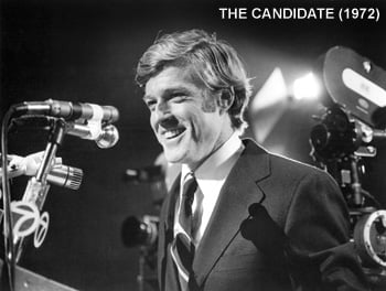 Bill McKay, as played by Robert Redford in Michael Ritchie's The Candidate, shares Obama's allure of youth and resume of community activism. Made in 1972, the year of the Watergate break-in and the McGovern debacle, it conveys the hip cynicism of the period. Voters are asked to choose between the wily old Senator Crocker Jarmon (Don Porter), who is owned by the usual special interests, and McKay, a handsome idealist, who auctions off his ideals as the possibility of winning becomes a reality. Neither of them says anything substantive, preferring to mine their particular banks of platitudes about experience versus change. The film has two fearsome moments that capture the mood of the times but also echo earlier movies.
