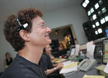 When the news clip tapes are all in and ready, O'Neil signals Spinney, who signals Stewart, and the show kicks off. It does, indeed, run like clockwork. The "Daily Show Exclusive" graphic hits its mark as planned when O'Neil calls for it, taking his cue from Stewart, but then Stewart seems to call for it again, and it isn't there. Instead, Stewart plays it off as a production foul-up and keeps going.