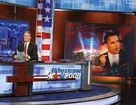 The Daily Show is arguably America's premiere forum for political satire, sometimes so tongue-in-cheek authoritative that it has itself become a prime news source for viewers. It is also a plum gig, renowned for its close-knit crew, great working environment and free lunches. The set is simple but versatile, with host Jon Stewart's anchor desk surrounded by projection screens that can double as green screens to do mock 'remotes' with correspondents. Televisions throughout the offices and control rooms at the Westside studio are tuned to CNN with the sound off, lending a counterpoint to a show that plays with the conventions of TV news.