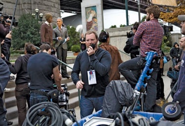 Even as some droplets of rain hit the pavement, Croll just keeps moving. "Get the bridge shot," he says, crouching beside a camera operator and framing the city skyline between his outstretched thumbs and forefingers. "Claudia, did you shoot them in the van?" he queries his segment director, Claudia Frank, through his headset to ensure that the contestants are being videotaped as they go from the house they are staying in to the restaurant.
