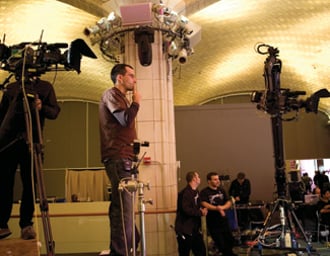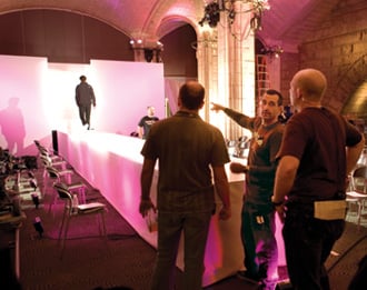 Once the scene is completed, Croll shifts his focus to the upstairs section of the restaurant, where the runway event will take place. A series of platforms have been pushed together to form a 75-foot-long runway and its backdrop is being painted and decorated. A dolly track has been set up alongside the catwalk and the camera operator is running through the shots that Croll assigned him. Similarly, the jib operator practices moving his giraffe-like contraption in and out of various high shots. "How was that shot?" he asks Croll. "Was it dynamic?"