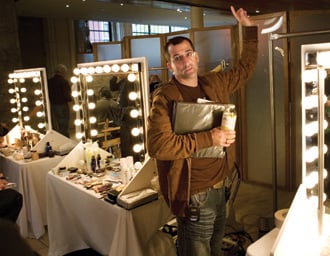 Continuing along, Croll begins a walk-through of the interior setup. First stop is the designated hair and makeup corner, where the contestants will be shot getting dressed for their first runway show. The lighting is bouncing badly off the mirrors. "I'm worried about squeezing down these mirrors," he says, instructing his gaffer to lower the bulb intensity. Just then, an acrid smell fills the air. "D.C., it smells like smoke," he says, calling to David Charles, his associate director, who sticks close by to solve problems like this. Without missing a beat, Croll returns to his discussion of lighting.