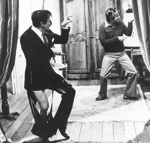 Examples abound of the director incorporating these lessons in his work, with Clouseau's violent mishaps topping the list, not to mention Jack Lemmon's Prof. Fate in The Great Race or Dudley Moore's George Webber in 10 (1979). But with Edwards' collaboration with Moore in 10, the story of a middle-aged man set loose in the sexual revolution, the director took the physical comedy of his earlier work and added a new level of social commentary. Still, there were plenty of pratfalls. Separating who is responsible for the laughs in a comedy is no easy task. "It's a little hard to answer who does what," says Edwards, when asked who is responsible for the laughs in a particular scene in 10 where a voyeuristic Moore gets beaned by his outdoor telescope and tumbles down a hillside, only to end up in his swimming pool once he makes it back up.