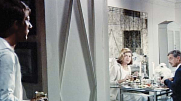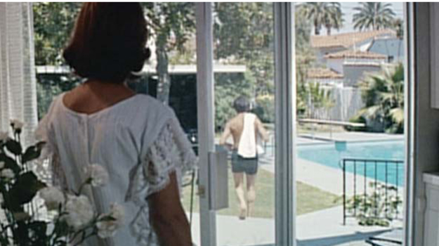 Benjamin has walked out of the last shot at home and I wanted him to walk into this one. We didn’t pan to him here. This moment is about his mother’s despair; it looks like exasperation, but it’s despair nevertheless, just like everyone else’s. His mother’s hair, the way he doesn’t look at her, everything, it’s all like Mrs. Robinson. He’s totally alienated from everybody, just short of disturbed. And the design is the same grid. The camera stays stationary as he gets smaller, going on his senseless journey and diving into the pool.