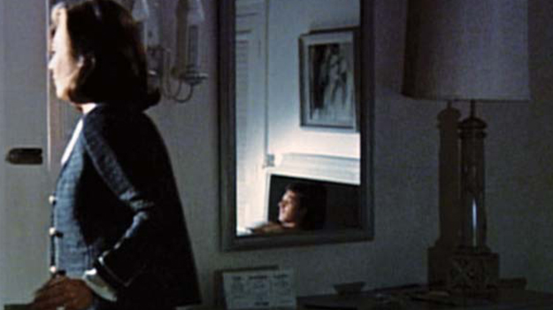The camera stays stationary on Ben until Mrs. Robinson leaves. She goes through the frame, back and forth, which I planned months before with Buck because I wanted to see this for the matching. The light is supposed to be coming from the television; the idea is that he’s pulled into it. To get Ben’s reflection, the mirror is in a completely idiotic place. We moved it and the bureau right next to the door so we could get him and not have to cut. The ‘slam’ when the door closes behind Mrs. Robinson is the only time you hear sound, and that had to be because it lands him at home on the cut. Sam O’Steen and I found that while editing.