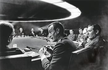 The next thing that catches Kasdan's eye is Ken Adam's linearly designed set for Ripper's office. "It's a very horizontal composition," Kasdan says, demonstrating with his hands. "A third of the screen is that horrible ceiling you find in any Air Force base, then the fluorescent light bouncing off the ceiling, and bouncing down onto Ripper. He seems completely isolated, alone, nuts, like an old medieval king on his throne."