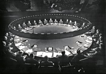 Next, the location shifts to the War Room and Kasdan is immediately drawn in by the beautiful introductory shot. "It's interesting because the shot of the Pentagon is standard establishing shot stuff," he says. "Then you cut inside and the lower half of the screen is all the men enclosed by an oval of light, and the top half of the screen is a panoramic-like view of the world. This circle of men, completely enclosed, is going to control the destiny of the entire world, which is pictured above them. When people wander out of [the circle] toward the sides they get a smoky look from the spotlights pointing in, which makes no sense but creates this lovely, crazy, spooky environment, cut off completely from the world. It's all done with a very wide-angle lens."