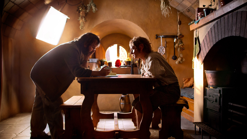 THE HOBBIT: Director Peter Jackson goes over a scene with Martin Freeman as Bilbo Baggins.