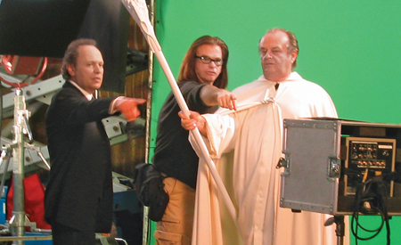 FUN AND GAMES: Miller (center) directs a bit using the Lord of the Rings as Billy Crystal interacts with Jack Nicholson holding Gandalf's staff