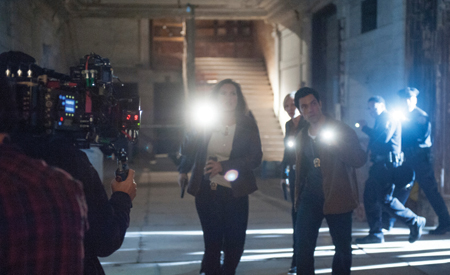 Location shooting, though, comes with its own set of variables. For Smith’s first SVU episode, featuring Harry Connick, Jr., it was five degrees outside with gusting winds. “I didn’t want the audience to notice the actors shivering,” says Smith. So he skipped rehearsals and went right to the first take. While prepping for this season’s opener, Slovis was thrilled to discover a location under the FDR Drive in Manhattan, sandwiched between the Manhattan and Brooklyn Bridges. “It was a huge panoramic shot, but it felt secretive,” says Slovis. During the shoot, however, “hundreds of cars a minute were running overhead. I can’t tell you how loud it was.”