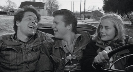 Sonny proceeds to the picture show to meet his less than inspiring, gum-chewing girlfriend, Charlene (Sharon Taggart), and makes a half-hearted attempt at necking in the back. They are soon followed by Duane and Jacy, who Bogdanovich introduces with a movie star close-up that stops Sonny’s breath. Jacy’s face is half lit by the reflection from the movie screen on which another beauty is mirrored, Elizabeth Taylor.