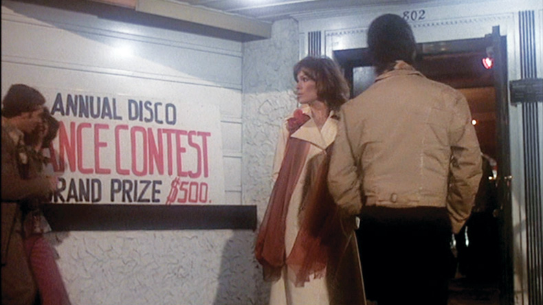 Stephanie (Karen Lynn Gorney) is waiting in the cold, concerned about the contest, wondering if Tony is going to show up. That sign that looks like it was done by hand? I remember being on our sign writer’s case, ‘It cannot look like it was professionally done. It’s got to look like Mr. Amateur trying to save a few bucks, like the raw feeling of the neighborhood.’ Then, when you get inside, we’ve created this magical fantasy; one with cracks showing, but just enough of a fantasy.