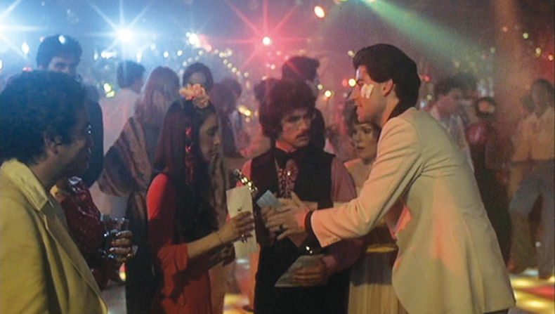 We’re on a Stage Crane, a clumsy thing, but it worked. It was hard to fit into the 2001 club, because the crane only went up to about 12 feet. You have to get the operator, focus puller, and camera all mounted on a platform that’s heavily counterweighted. This is a very gentle move, to give you the geography of the place and the mood without being static. As for playback of the music, the important thing was that it be identical with the final track. It’s not a good idea to just have a rhythm track. I told the Bee Gees, ‘Guys, give me your latest demos for playbacks, but please promise you won’t change the tempo.’
