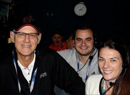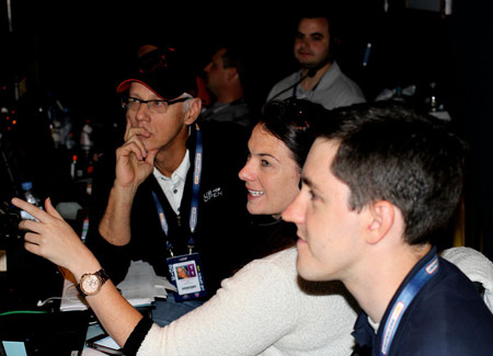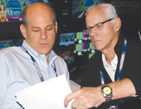 TEAMWORK: (above, top to bottom) Fishman with his longtime producer Bob Mansbach; world feed director Jim Cornell; and AD Jason Ross; Fishman (right) mans the board with Mansbach.