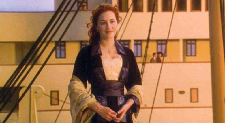 This frontal wide two-shot at the railing and the next frame are from the same take, the perfect alignment of all elements in which the camera moved in and we just hit pure gold. The wind happened to blow the smoke backwards out of the funnels beautifully. The lighting was spectacular, but there was no time for a rehearsal, so we just shot it. At the time we were shooting another scene, meaning Kate had to go through a complete wardrobe, wig and corset change, then race back to the set. When she jumped onto the ladder she took one look at the sun and turned and yelled at me as loud as she could, “SHOOT! SHOOT NOW!” [laughs] I’d never heard an actress do that before.