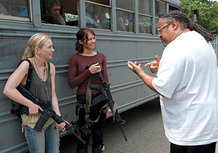 Walkers: Director Ernest R. Dickerson, who has directed 11 episodes, directs Emily Kinney and Lauren Cohan on an exterior set of The Walking Dead. (Photo: Gene Page/AMC)