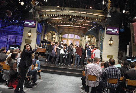The stage managers also handle emergencies. A video on the SNL website captured what happened when a wall jack broke during a commercial. With only seconds to air, Kelly marshals the crew to hold the wall in place from behind. It's still wavering when the camera fades up. King can be heard saying in the background, "Just get the desk in and we'll go." Rositano is out of view, blocking the actors from the stage until it's safe. "When you hear the opening applause," Kelly says, "it's for us."