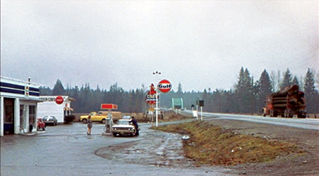 Soon afterward, Bobby, once more bruised by interaction with his clan, leaves with Rayette. At a gas station, while Rayette's inside, he hitches a ride with a logger. Rafelson cuts to a wide view showing the logging truck pulling onto the road, a shot that lingers through superimposed end credits, while the small figure of Rayette can be seen wandering around, looking for a Bobby that isn't there, literally and figuratively.