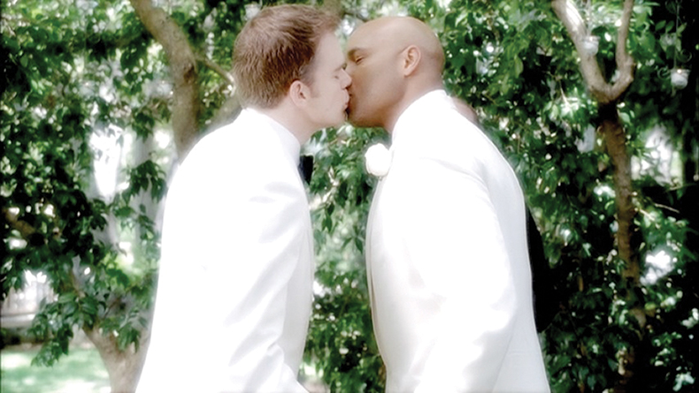 [In the first scene from the future] David (Michael C. Hall) and Keith (Mathew St. Patrick) are getting married. It was not yet legal when I wrote it, but gay couples were having weddings anyway, and I figured a few years in the future, who knows? We were on location and used mostly natural light. Then, in post, we kind of blew it out, as we did with all these glimpses of the future. I love the way that worked on Keith and David’s white tuxes, as if they’re glowing, which feels appropriate. They are out in the world, the sun is shining, this is the big, beautiful day.