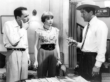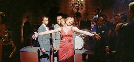 Emotional Coloring: (top) Ginny defers to her rival Gwen (Martha Hyer); (middle) A lovesick Ginny belts out a song off-key; (bottom) Dave finally falls for Ginny through a closed window. (Photos: Screenpulls: Warner Home Video; (bottom) Photofest