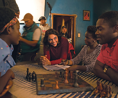 With Phiona Mutesi in Queen of Katwe, director Mira Nair had to confront the matter of making the fairly abstract game of chess visual, and visceral. "I always start from the groundwork of cinéma vérité, a cinema based in reality. I live in Kampala, where Phiona's Katwe neighborhood is located, so I knew this place, and explored it with her and her mother, as if we were making a documentary. The chess was something I had to learn, and Phiona taught me. Her lines to me, like 'Mira, you must consider the other side of the board,' were put into the script, because it quickly helped explain the thinking behind the game so well. I wanted to create a prismatic story, told from various characters to indicate that it takes a village to foster a genius like Phiona."