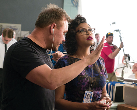 (Top) Theodore Melfi directs Taraji P. Henson in Hidden Figures; (Bottom) Oliver Stone huddles up with Shailene Woodley and Joseph Gordon-Levitt on Snowden (Photos: (Top) Hopper Stone; (Bottom) Mario Perez)