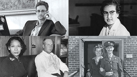 Iconoclasts: (Clockwise from top left) Exiled CIA whistleblower Edward Snowden; mathematician and NASA recruit Katherine Johnson; conscientious objector and war hero Desmond Doss and his wife Dorothy; Mildred and Richard Loving, who successfully challenged a statue barring interracial marriage in Virginia. (Photos: (Clockwise from top left) Barton Gellman/Getty Images; Courtesy of NASA; Library Of Virginia; Bettman/Getty Images)