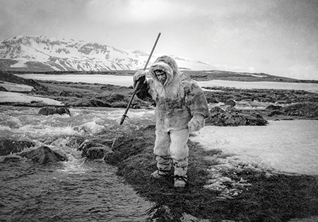 They even tracked down Panchro lenses from the '30s. "We absolutely were pretending to be Flaherty," says Buono, "limiting ourselves to a panning shot at most, because he had a big heavy camera, locked off most of the time because he was trying to do everything himself." Directing the actors—Armisen as Kunuk, and John Slattery, as their version of Flaherty—involved specific blocking, since dialogue wasn't an option. Says Thomas, "It was all physical, in the posture, the gestures. It was like staging a play, where you had this proscenium. It was definitely a weird exercise. John Slattery, bless him, he came all the way to Iceland with us not to say a single line."