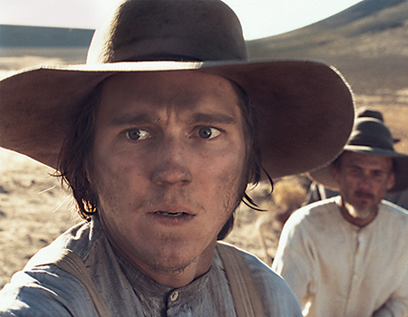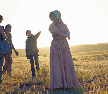 (Top) A scene from Meek's Cutoff with Paul Dano. (Bottom) The director frames a shot on the set of her current release, Certain Women, with ensemble player Kristen Stewart looking on. (Photos: (Top) Thunderegg, LLC; (Bottom) Jojo Whilden)