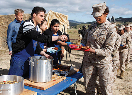 (Top & Middle) Director Brian Smith shows solidarity with the U.S. military during a large-scale production of MasterChef, while contestants serve the troops; (Bottom) Director Paul Starkman keeps the action on track on Top Chef. (Photos: (Top) Courtesy Brian Smith; (Middle) Everett; (Bottom) Courtesy Paul Starkman)