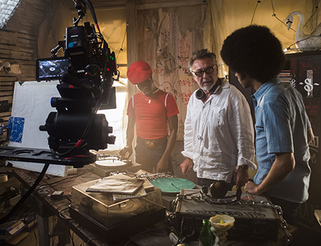 Ed Bianchi, center, brings "two turntables and a microphone" to life while filming The Get Down. (Photo: David Giesbrecht/Netflix)