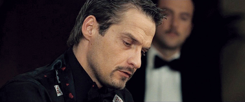 Le Chiffre, with a full house, aces over sixes, rebounds with a defiant smile, glancing over at his paramour with confidence. "In terms of reaction shots from people in the wings, we had all the actors there, so we pretty much stuck with continuity, which was unusual, but the game was too complex to shoot out of order. Every time we called cut, we had six props people restoring everything to what it was before."