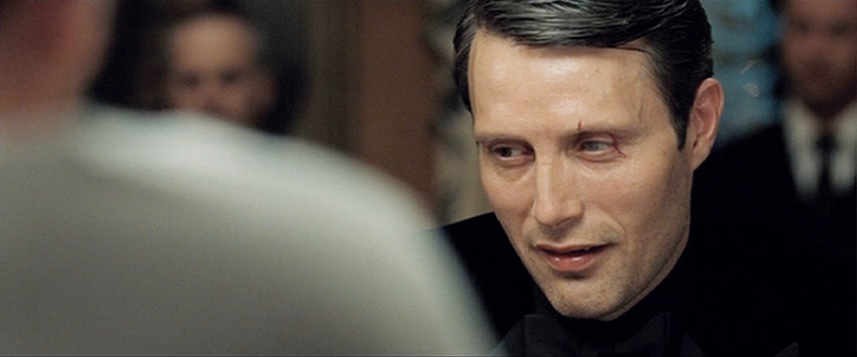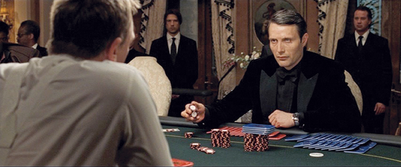 In this case it's Bond and the film's arch villain, Le Chiffre (Mads Mikkelsen), who is gambling with $150 million of a terrorist organization's money, and therefore his life if he loses. The two engage each other throughout in what Campbell calls a "competitive, eyefucking stare." The following sequence comprises the game's final round, which has narrowed down to four players.