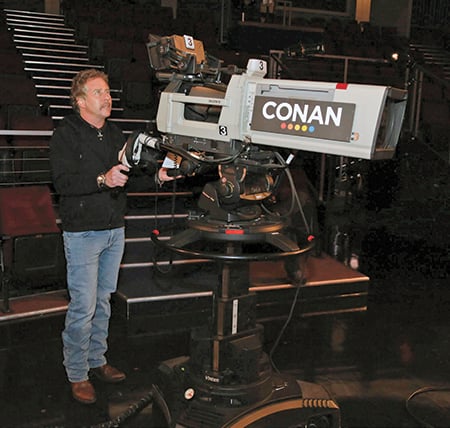 Billy Bollotino, who directs Conan, says once host Conan O'Brien is out onstage, "he's in the zone, and basically, it's my job to stay one step ahead of him." (Photos: (Top) Chris Millard/Team Coco; (Bottom) Meghan Sinclair/Conaco, LLC for TBS)