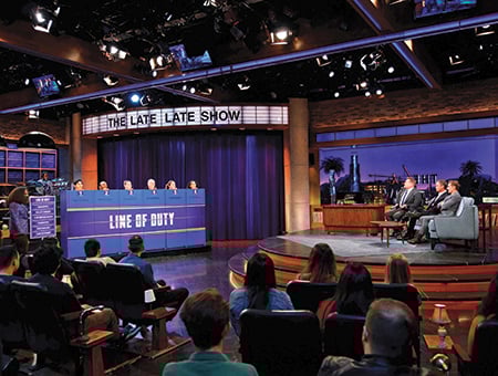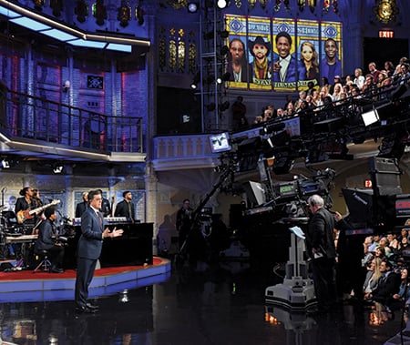 Another challenge is the guest sequence. Corden, unlike the other hosts, brings all of his guests onstage at once and seats them on a curved sofa so they can easily engage in a buoyant four-way conversation. Mancinelli not only has to adjust his cameras for each person's different depth-of-field plane, he needs ample coverage for any editing that might be required before the show airs. "I have to shoot so that we can edit," explains Mancinelli. "We have more people now that we have to cut around."