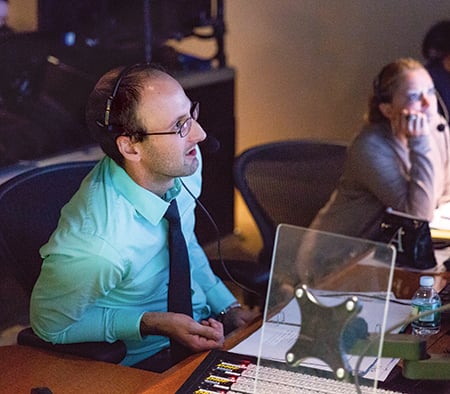 "We shoot pretty much 360 on that stage," says Mancinelli, who is constantly devising new camera angles. "We'll shoot under the bleachers and in the control room and in reverse." All of which is tricky. "When you shoot 360," he explains, "you're always trying to avoid all the cameras."