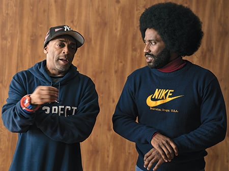 Spike Lee guides leading man John David Washington on the set of BlacKkKlansman. (Photo: David Lee/Focus Features)