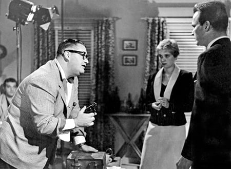From top: Robert Aldrich with Lee Marvin on the set of The Dirty Dozen (1967); directing Gaby Rogers and Ralph Meeker on the 1955 noir classic Kiss Me Deadly; showing how it's done on the WWII drama, Attack (1956). (Photos: (Top to Bottom) Photofest; Everett (2))