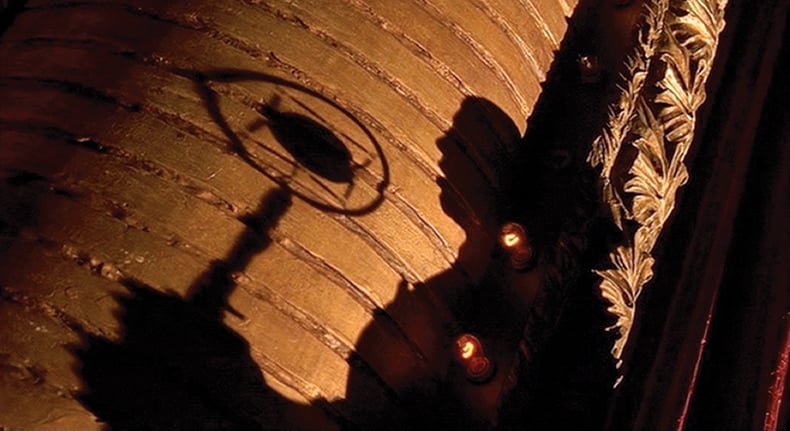 Now we're on stage and Roxie has literally become the dummy to Billy's ventriloquist. Her look has changed drastically to make her as artificial as possible. Billy's style is classic vaudeville for sure, with a little bit of rouge for theatricality. Its look is enhanced by vaudeville uplight, so that it feels a little macabre. This shot comes at the end of a long dolly push-in that went flying down the center aisle. We ramped camera speed to really slam into the number. I remember we did it a bunch of times, trying to make it smooth enough for the speed ramp.
